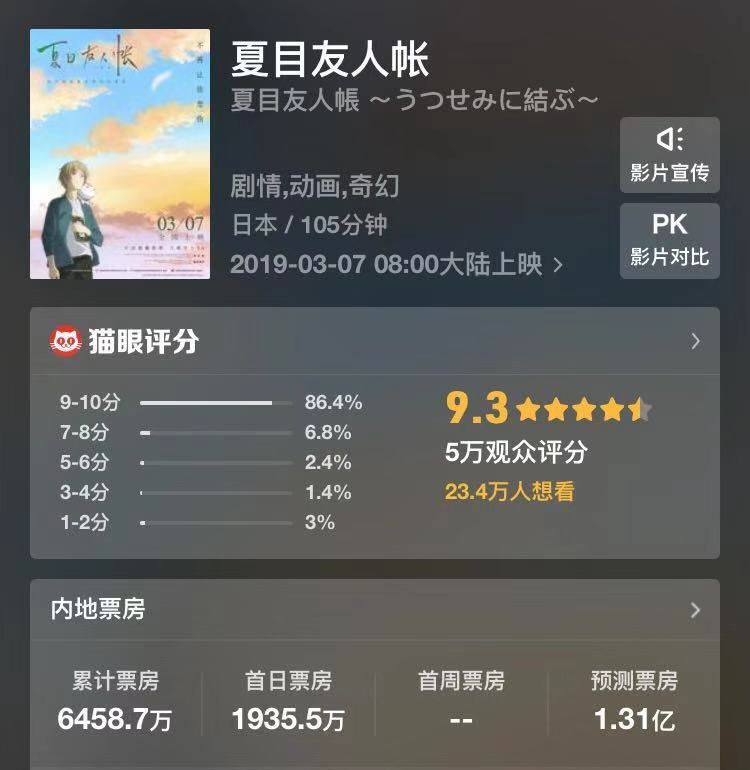而这些原因,让《夏目友人帐》即便已经在日本本土上映了大半年,并且国内票房市场前有《绿皮书》、后有《惊奇队长》的情况下,依然保有自己的一方晴空。