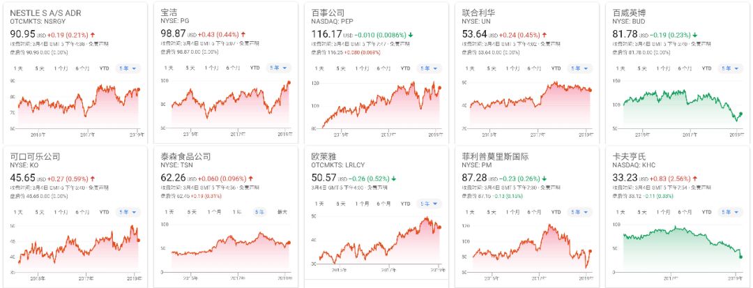 上图是雀巢(PINK:NSRGY)、宝洁(NYSE:PG)、百事(NASDAQ:PEP)、联合利华(NYSE:UN)、百威英博(NYSE:BUD)、可口可乐(NYSE:KO)、泰森食品(NYSE:TSN)、欧莱雅(PINK:LRLCY)、菲利普莫里斯(NYSE:PM)、卡夫亨氏(NASDAQ:KHC)——十大快消品巨头的股价表现。