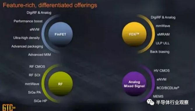 基于自身工艺技术能力,格芯提出了FinFET、FDX、RF和Analog Mixed Signal四大平台的发展战略。