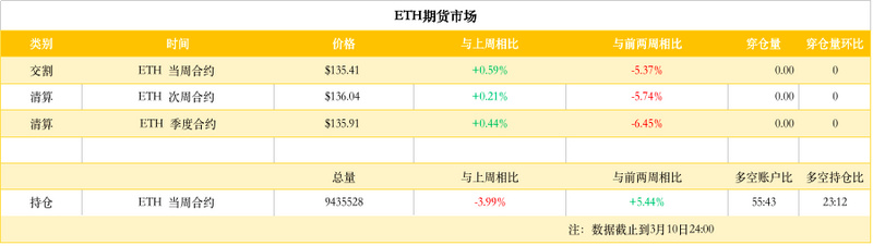 OKEx数据显示,期货交割层面,ETH 当周合约交割价格为 135.41 美元,与上周相比环比微涨 0.39 % ,季度合约与次周合约均小幅微涨 ;不过,所有合约相较于两周前,仍然下跌超过5 %。