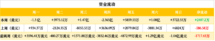 资金方面,本周资金相较于上周出现大幅波动,其中周四净流出资金最高,达到 2.36亿美元;周三净流入资金最多,达到 1.47 亿美元;ETH 本周全网资金净流入约 2407 万美元,环比上涨 510 %,打破了连续 4 周资金净流出的局面。
