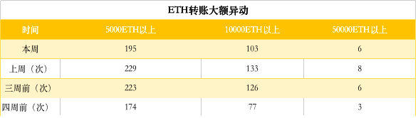 此外,5 万以上 ETH 大额转账的次数达到 6 次,最高转账数额为 17 多万枚 ETH,几笔大额转账最后汇到富豪榜排名前50 的地址,疑似大户抄底。