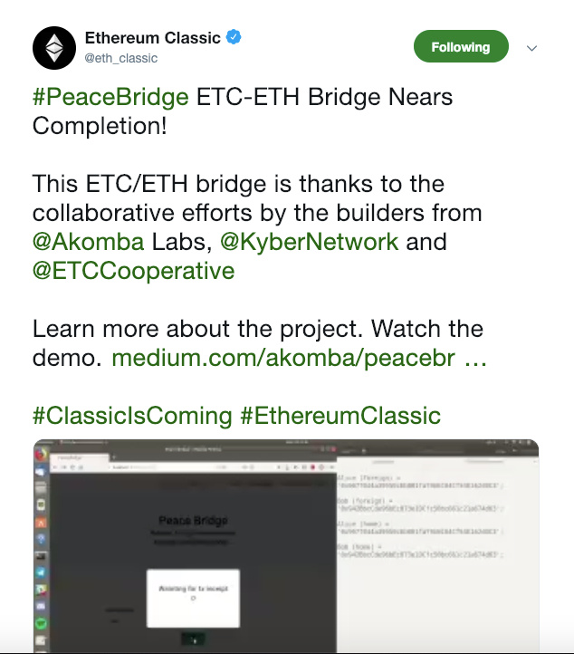 ETC官方也宣布,一座“和平之桥”现在正处于最后阶段,ETC很快将以一种名为“TETC”的独特代币在以太坊区块链上实现代币化。据悉,托管人可以在ETC区块链上创建一个智能合约以及在合约中锁定ETC,并在ETH区块链上创建一个发币智能合约,然后在这个合约中“打印出”TETC。为了让ETH(ETC)区块链了解链上发生的变化,这个过程中采用了一种包含复杂加密经济学的权威证明(POA)。[原文链接]