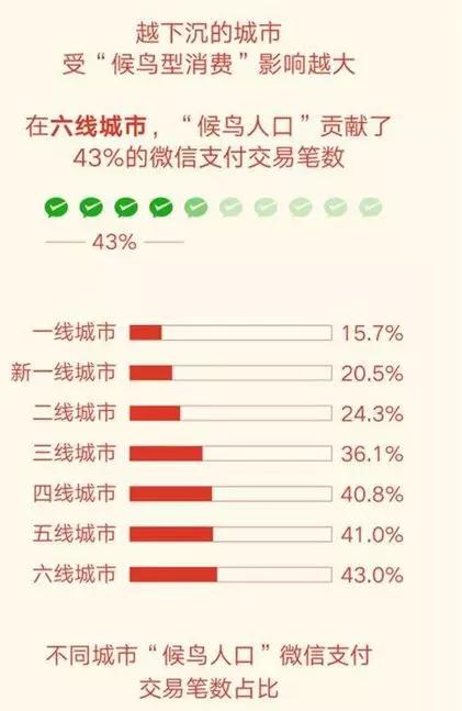 越下沉的城市,受“候鸟型消费”影响越大。三线及以下城市,“候鸟人口”均贡献了超过30%的微信支付交易笔数,其中在六线城市,“候鸟人口”贡献了43%的微信支付交易笔数。