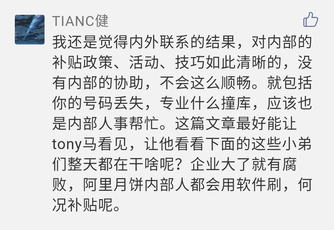 还有网友认为,内外勾结的情况应该是存在的,“对内部的补贴政策、活动、技巧如此清晰,没有内部的协助,不会这么顺畅”。