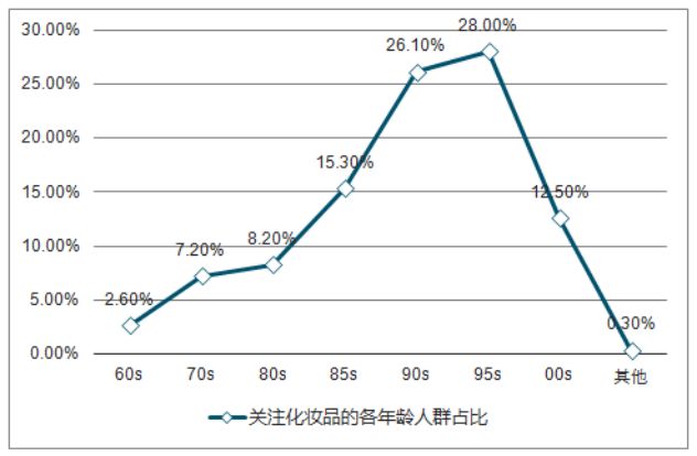 数据显示,近年来90后化妆品消费占比逐渐增大,且已经成为微博上关注化妆品的主要人群。