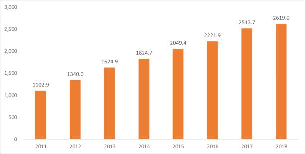 2018年我国限额以上化妆品零售额为2619亿元,同比增长9.6%,超过社会消费品9.0%的平均增幅。Euromonitor预计2022年我国化妆品行业整体市场规模或可达到5352亿元,年复合增长率达8%。