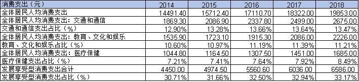 根据国家统计局数据,近五年来发展享受型消费支出(通信、教育及医疗支出)占全体居民人均消费支出的比例稳步上升,由2014年的30.71%上升至2018年的33.17%,同时恩格尔系数则持续下降至30%以下,体现了我国长期消费升级的趋势。