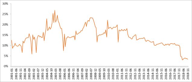 图3:2018年社零消费增速持续低迷并创03年以来新低