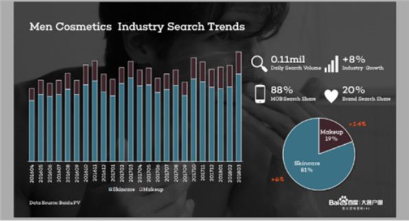 百度大数据显示,2017年中国男士在百度平台关于化妆品的相关日均搜索量达11万,移动客户端贡献了88%的搜索量,整个男士化妆品行业占比增长8%,而护肤领域相关检索词占比较2016年增长了6%,男士彩妆的相关检索词占比从2016年的5%提升到了19%。
