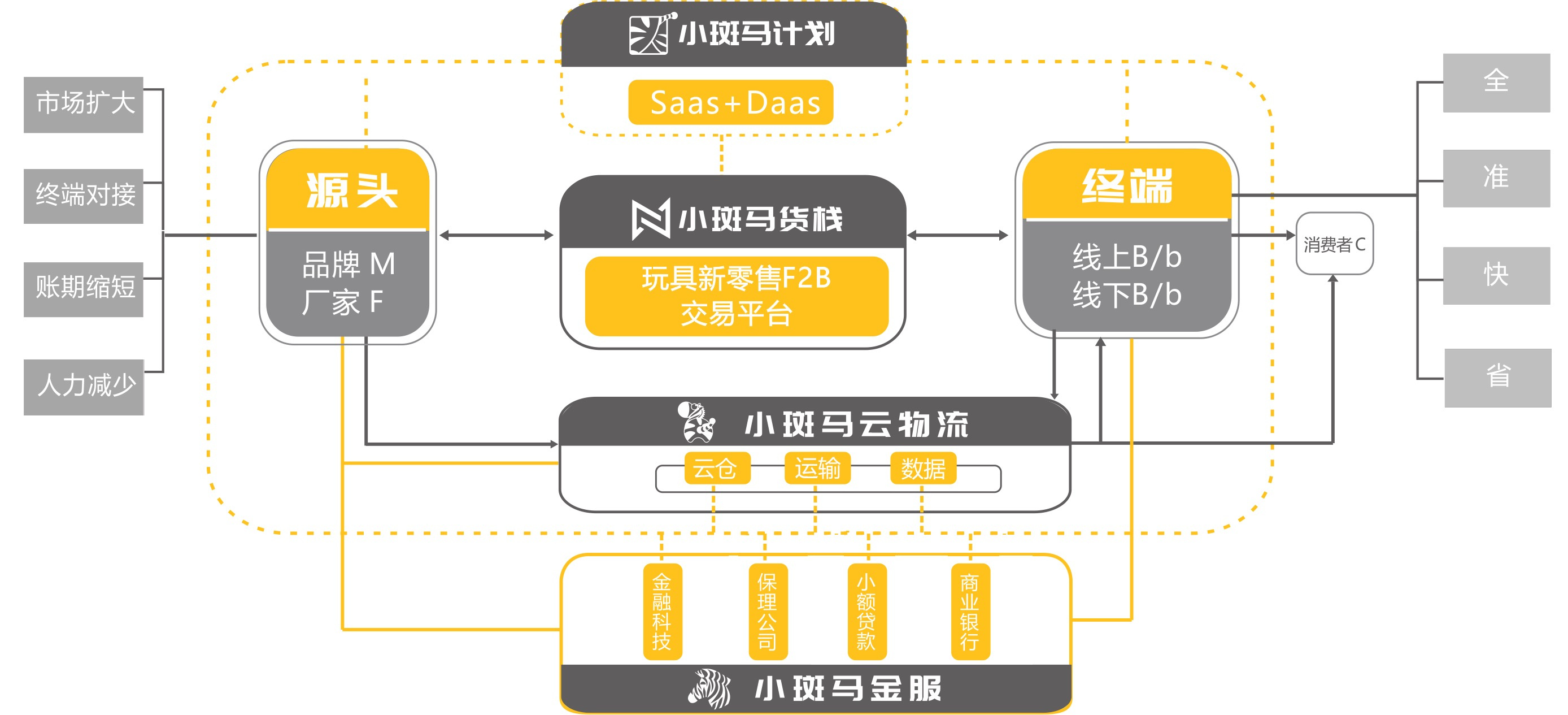 具体来说,小斑马建立了一个供应链管理中台(SaaS),将玩具产业链上各个角色的管理系统接入,帮助上下游企业在一套系统里管理所有供应链环节,由大数据智能决策系统优化供应链管理效率,并提供供应链金融、仓配一体化等服务,以实现商品从生产端到零售端全生命周期的管理,以实现信息流、商流、物流、资金流、数据流五流合一。