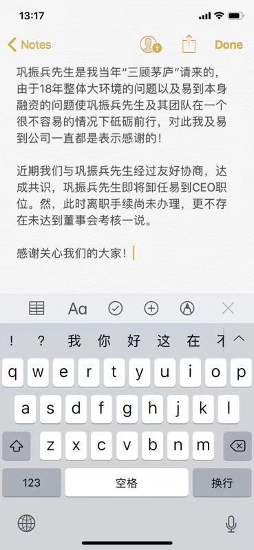 36氪讯,针对易到CEO巩振兵将离职的传闻,韬蕴资本CEO温晓东在朋友圈发文回应称,“近期我们与巩振兵先生经过友好协商,达成共识,巩振兵先生即将卸任易到CEO职位。然,此时离职手续尚未办理,更不存在未达到董事会考核一说。”