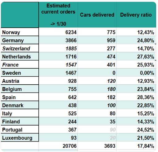 所以,Model S/X销售大幅下滑,不容乐观,而Model 3销售超1300辆,有分析支出以上三地区销量占公司2月Model 3总销量的约39%。以此推算,预计本季度欧洲交付近2万辆的投资者可能要失望了。下图列出了各地预计订单、已交付及交付比例的。