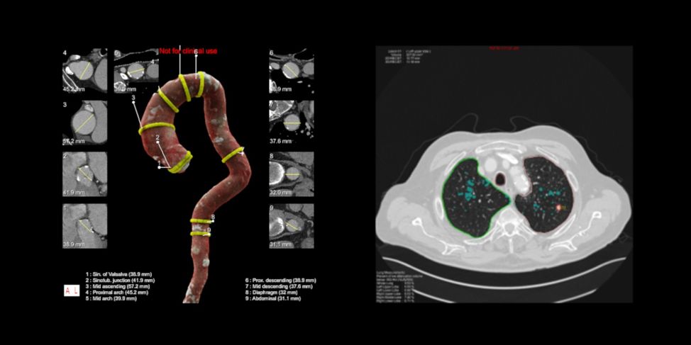 西门子的AI-Rad系统针对胸部CT影像,提供多方面的测量、定位和自动报告生成功能。比如,借助影像分割技术,找出胸部CT影像中大动脉的像素级定位,实现对动脉直径等多方面的自动化测量。该系统还利用目标检测技术,对体内器官的各项异常进行定位和初步诊断。