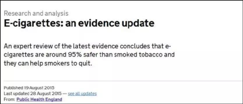 电子烟刚投入到市场时,全球各国对电子烟的态度不一,英国却采取了相对自由的市场。2015年8月份,英国公共卫生署发表了一项报告称:电子烟是一种更安全的替代传统烟草的方式。之后英国皇家医学院也发布报告称电子烟已经帮助超过数千名的人士不再抽吸传统卷烟。