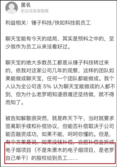 2019年1月,锤子科技创始人罗永浩在“聊天宝”的发布会上,顺势为前员工朱萧木的“Flow福禄”电子烟站台。近日,一位自称是前快如科技员工的匿名人士在头牌观点上爆料称,离职补偿金有可能折算成(老罗自己单干的)电子烟项目股权。