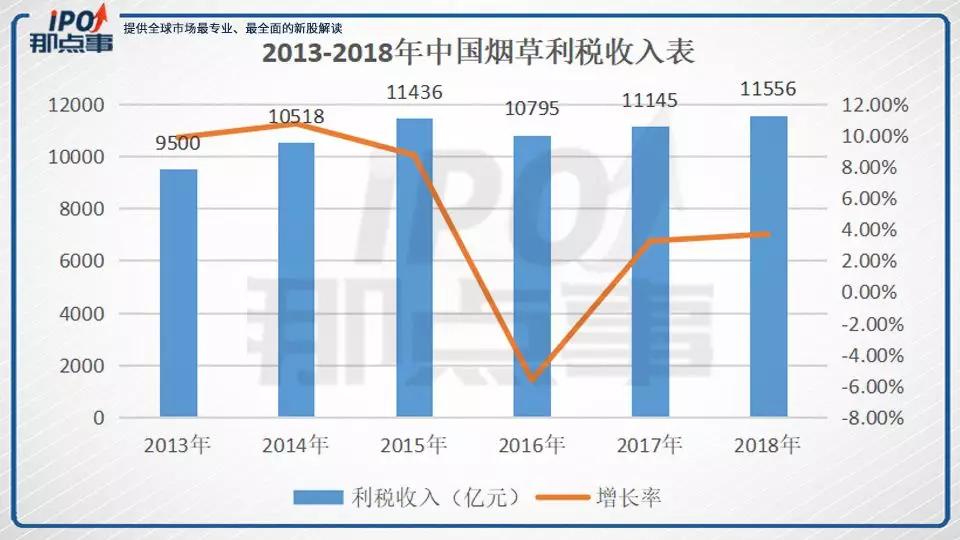 中国烟草是一个万亿级的市场,体量巨大的烟草消费市场给政府带来了丰厚的税收。2018年烟草行业全年实现税利总额11556亿元,同比增长3.69%;上缴国家财政总额10000亿元,同比增长3.37%;实现工业增加值7877亿元,同比增长4.88%。简单算算,2017年中国烟草实现税利总额=BAT+工行+建行+农行。