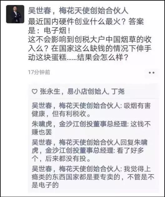 趁着政策监管还没真正落地,传统烟草巨头也暂未入局,2017年开始掀起的这股电子烟创业风潮,最近越发猛烈了。巨大的利益面前,创投们总能“抓住”当下的机会,管它以后是什么洪水滔天,先咽下这口“烟”再说。