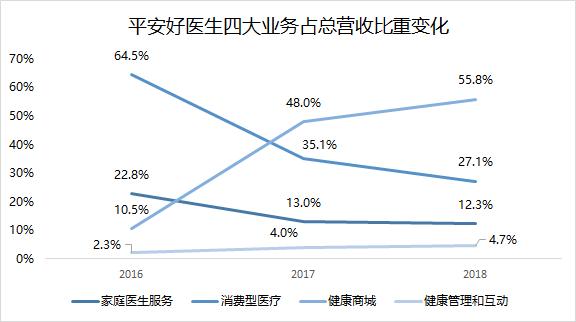 不过还没等家庭医生服务挑起大梁,平安好医生体系内已经孵化出更为耀眼的健康商城业务,截至2018年,健康商城业务占好医生营收比重已经过半,而家庭医生服务占比则下滑至12.3%,与互联网医疗相比,平安好医生倒是更像一家医药电商公司。