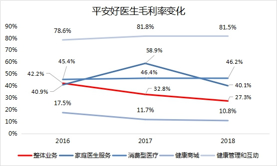 然而,发展电商也有弊端。在四大业务中,健康商城业务毛利率贡献最低,随着健康商城业务营收占比进一步扩大,其对整体毛利率的拖累作用将更加明显。2018年,平安好医生的整体毛利率已经下滑至27.3%,显著低于其他互联网公司,甚至要低于业务构成以医药电商为主的阿里健康。