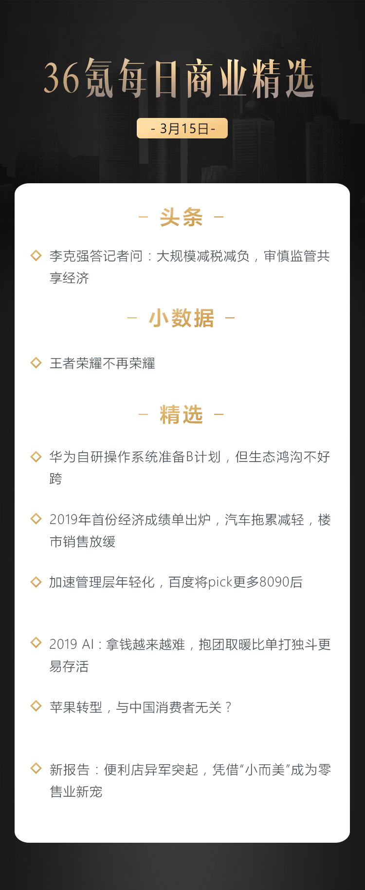 本文来自36氪付费栏目《36氪每日商业精选》——3月15日