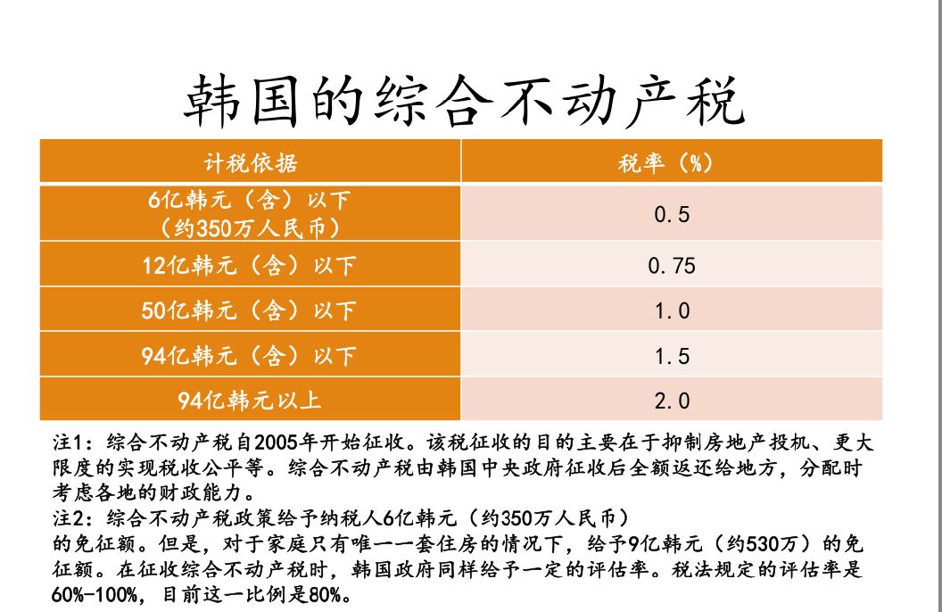 2005年韩国开始征收综合不动产税,征税对象是6亿韩元以上的住房,税率是1%至3%。原来的综合土地税和财产税合并成新的财产税,作为地税满足地方一般财政需求;综合不动产税是国税,中央征收了以后全额返还给地方。分工明确的同时,缓解了中央和地方之间的税收对立关系。