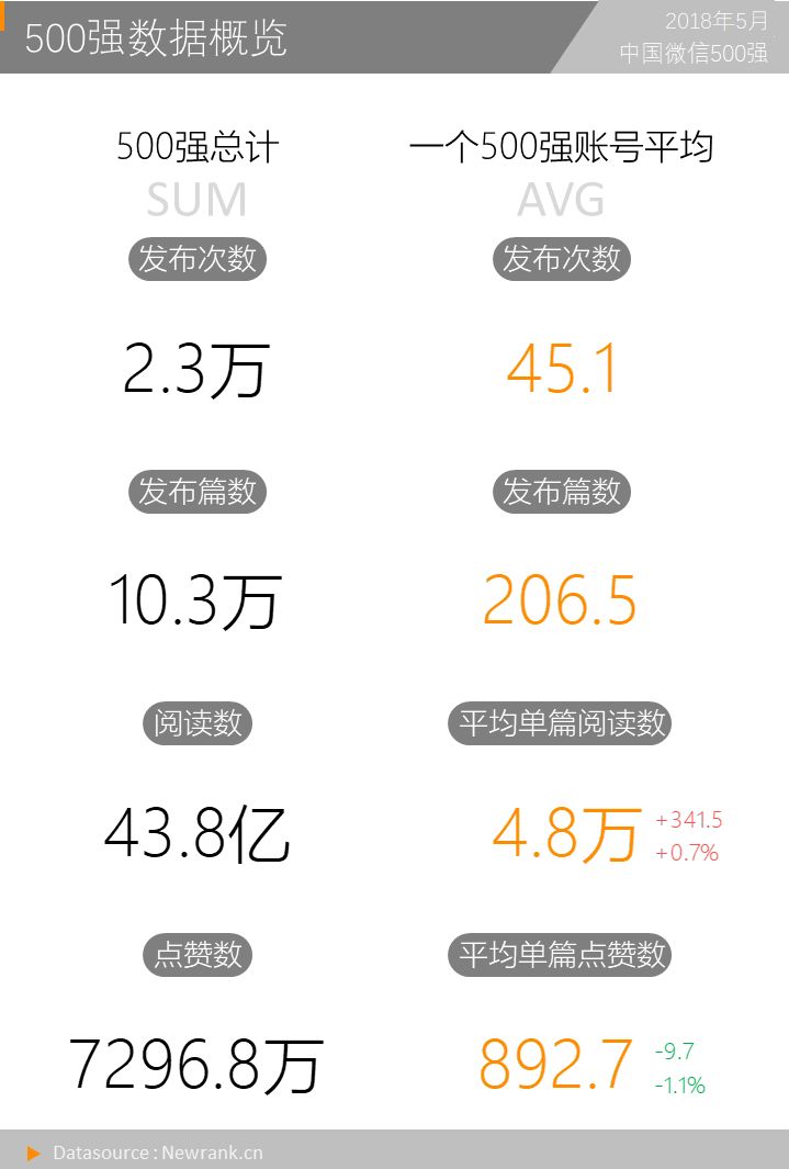 我们继续缩小范围,以新榜中国微信500强的数据为例,根据新榜出品的《2018年中国微信500强年报》,去年全年,平均单篇文章的点赞数为722.2次,这个数字包含改版后的“好看”数据。
