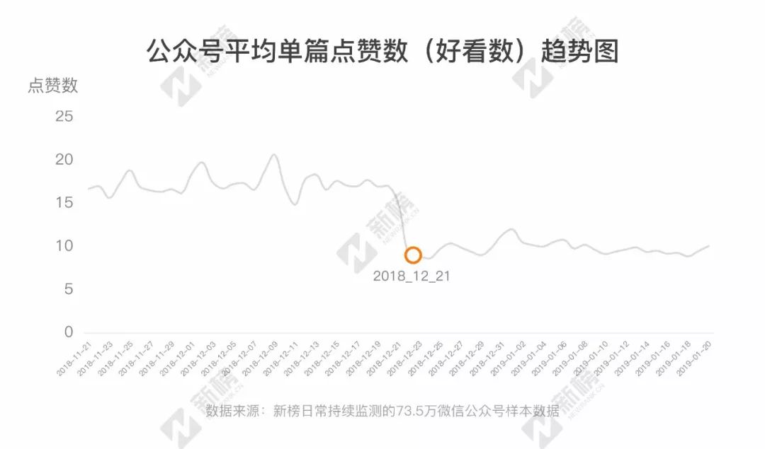 从数据上来看,去年改版前后,好看数较点赞数大幅下跌。下图为去年12月21日前后微信公众号每日的平均单篇文章点赞数的走向: