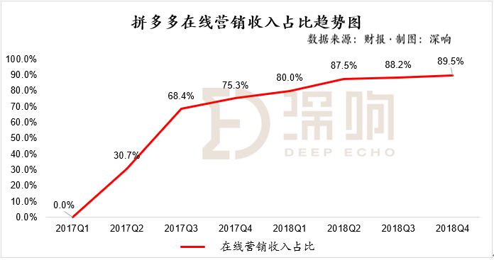我们在分析过去两年拼多多收入组成过程中发现了一个明显的趋势,拼多多自2017年开始,连续7个季度在线营销收入占比持续上升。