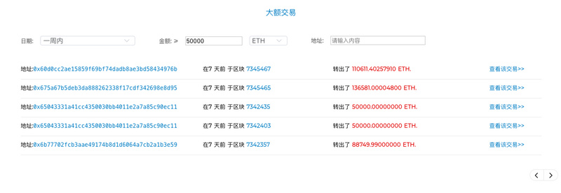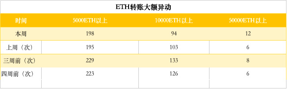 此外,5 万以上 ETH 大额转账的次数达到 12次,最高转账数额为 13 多万枚 ETH,几笔大额转账最后汇到富豪榜排名前 100 的地址,疑似大户抄底。