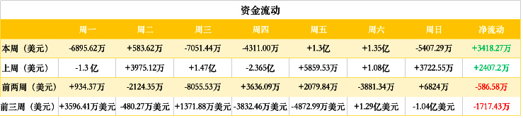 资金方面,本周资金继续大幅波动,其中周三净流出资金最高,达到 7051万 美元;周五以及周六净流入资金较多,均超过 1.3 亿美元;ETH 本周全网资金净流入约 3418 万美元,环比上涨 42 %。
