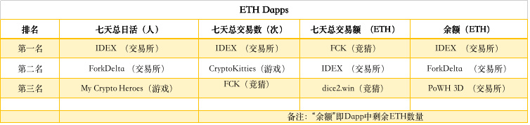 另外,“交易所” Dapp IDEX 继续表现突出,无论是日活,还是交易额,均榜上有名。据悉,IDEX 是一家去中心化的交易所。推荐阅读Odaily星球日报关于 IDEX 的体验稿《亲测去中心化交易所IDEX,真的不适合小白用》。