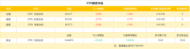 OKEx数据显示,期货交割层面,ETH 当周合约交割价格为 132.57美元,与上周相比环比微跌 2.25% ,季度合约与次周合约均小幅微跌 2% ;所有合约相较于两周前,仍然微跌 1%。