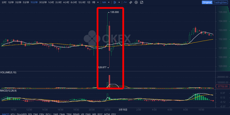 不过,本周合约也出现“插针”现象,短时间内价格暴涨暴跌,如下图所示: