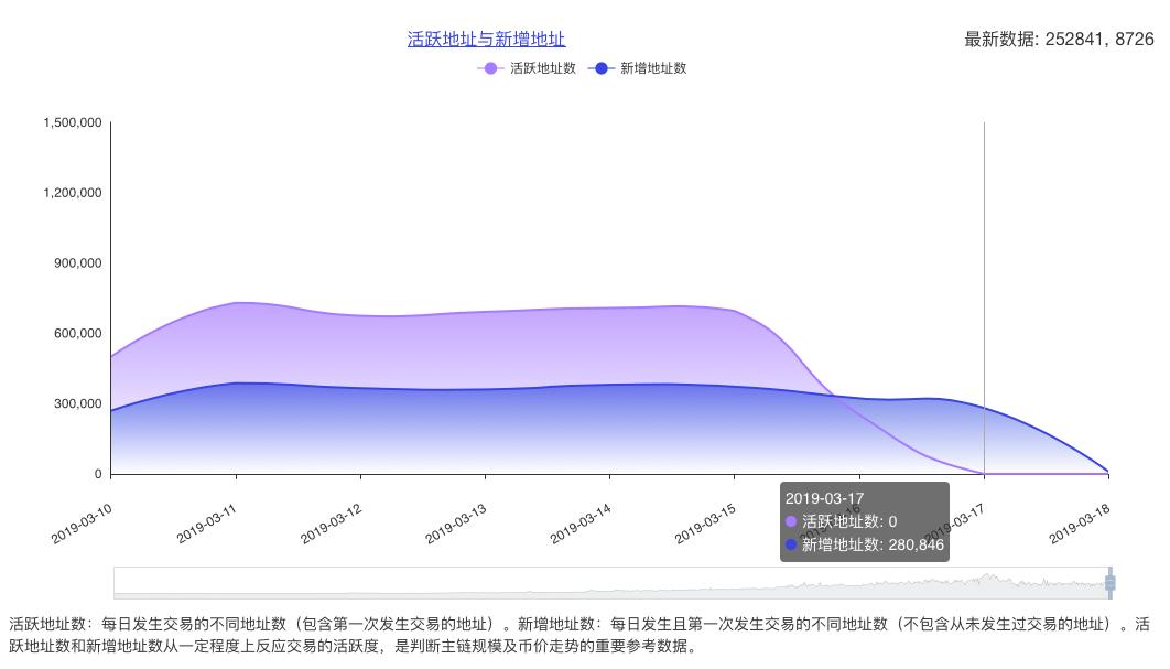 本周新增地址数和活跃地址略有增长,截至 3 月 10 日,新增地址数 280846 个,较上周增加 12304 个。活跃地址根据当前最新数据为 252841,较上周减少 246070 个;