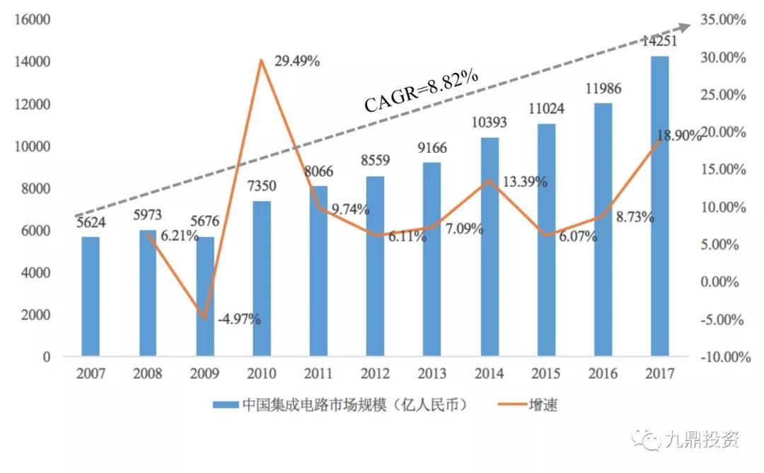 图3:2007-2017年中国集成电路市场规模及增速