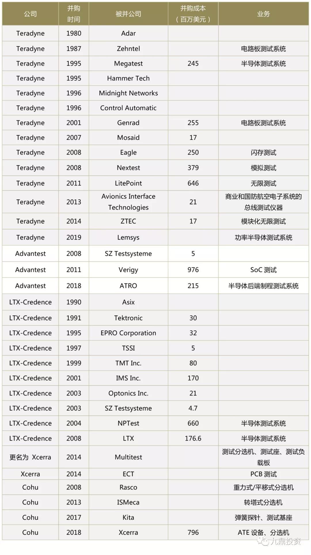 下表整理了占全球半导体测试设备约80%市场份额的四巨头泰瑞达(Teradyne)、爱德万(Advantest)、科休(Cohu)和科利登(Xcerra)的并购史。