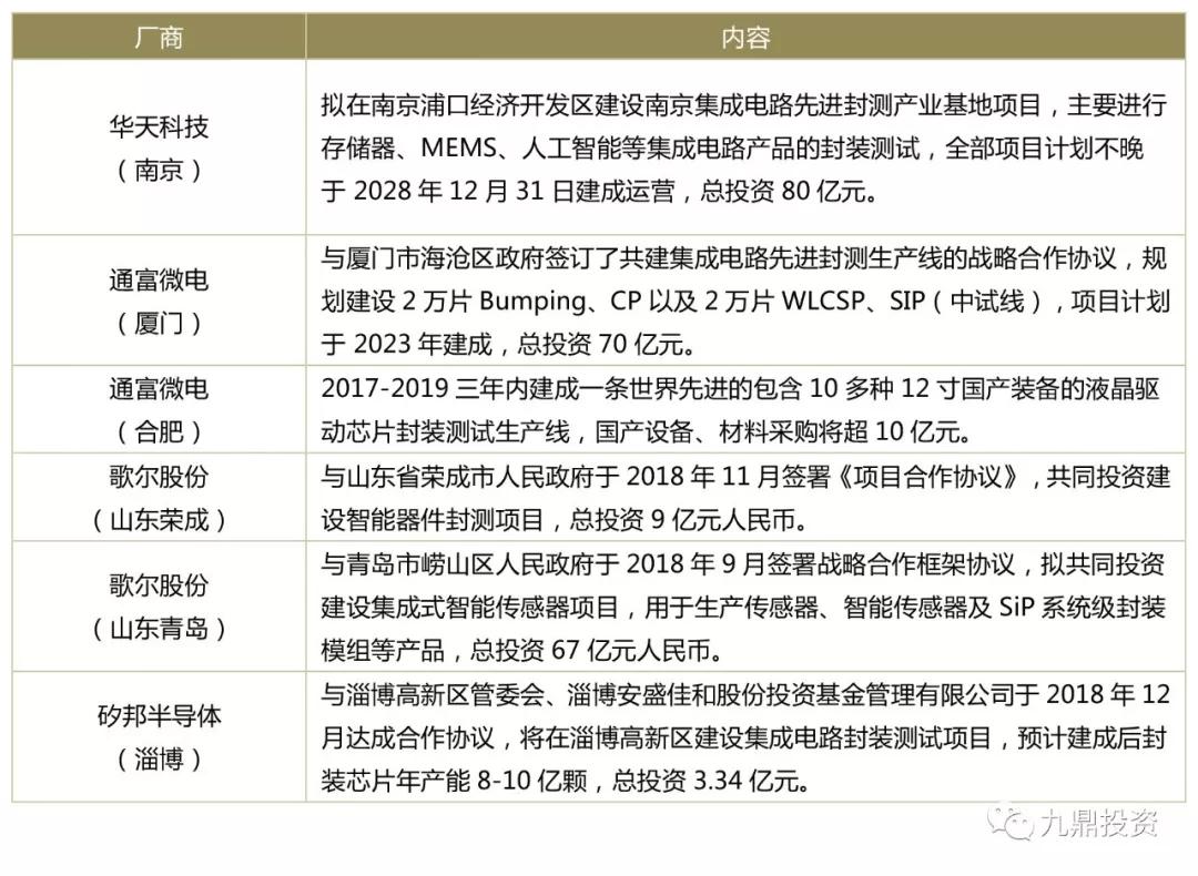表2:2018年部分封测产线规划信息