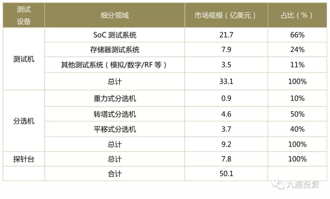 根据SEMI数据统计,2015-2017年全球晶圆加工设备、测试设备、封装设备以及其他设备三年累计销售额占比分别为80%、9%、6%、5%。以此测算,2017年全球半导体测试设备市规模为50.1亿美元,其中,测试机、分选机和探针台占比分别为65%、18%、17%。对应的市场规模分别为33.1亿美元、9.2亿美元和7.8亿美元。