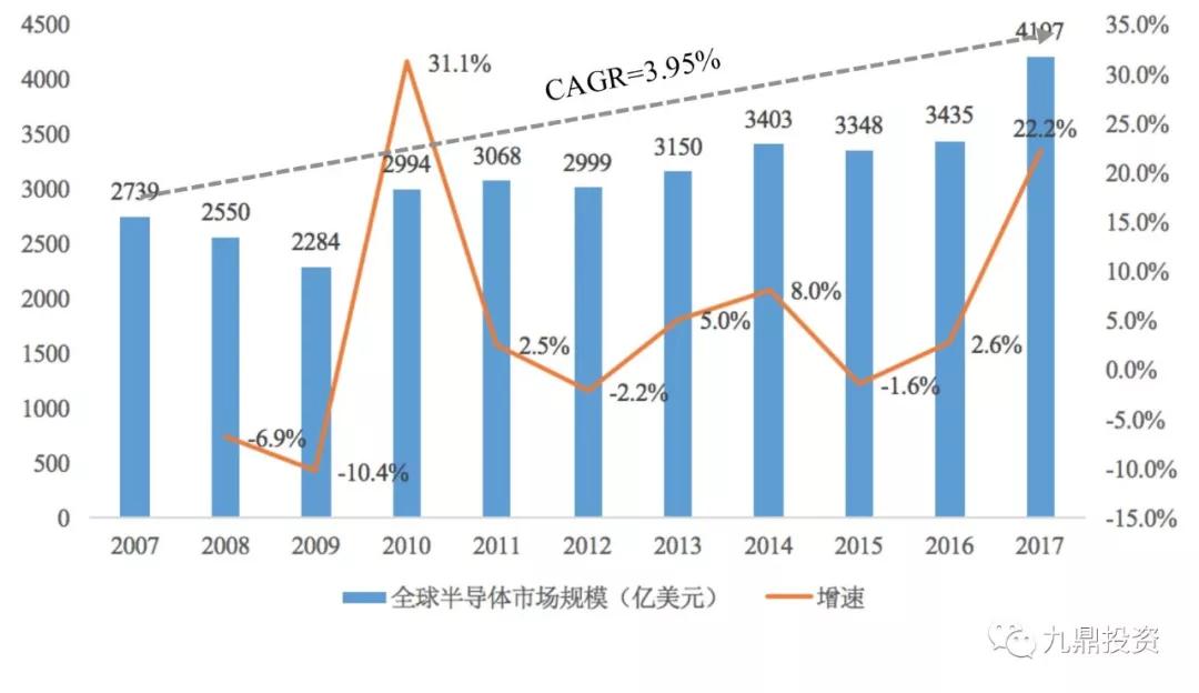 图2:2007-2017年全球半导体市场规模及增速