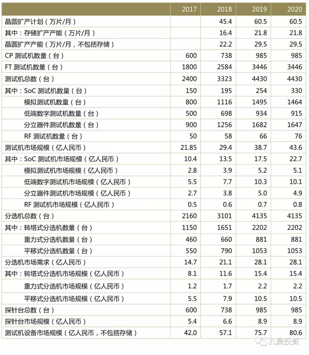 随着2018-2020年中国大陆多家晶圆厂陆续投建及量产,国内封测厂将陆续投入新产线以实现产能的配套扩张,将带动国内半导体测试设备市场高速增长。根据九鼎投资市场调研分析,2017年国内半导体测试设备市场约42亿人民币(不含存储测试设备),预计2020年国内半导体测试设备市场需求将达到80.6亿人民币(不含存储测试设备)。
