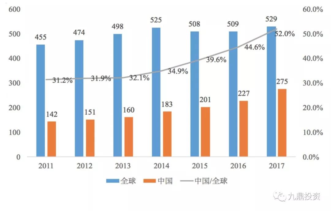 数据来源:全球数据来自WSTS,中国数据来自Wind(按1美元=6.88 人民币计算),九鼎投资整理