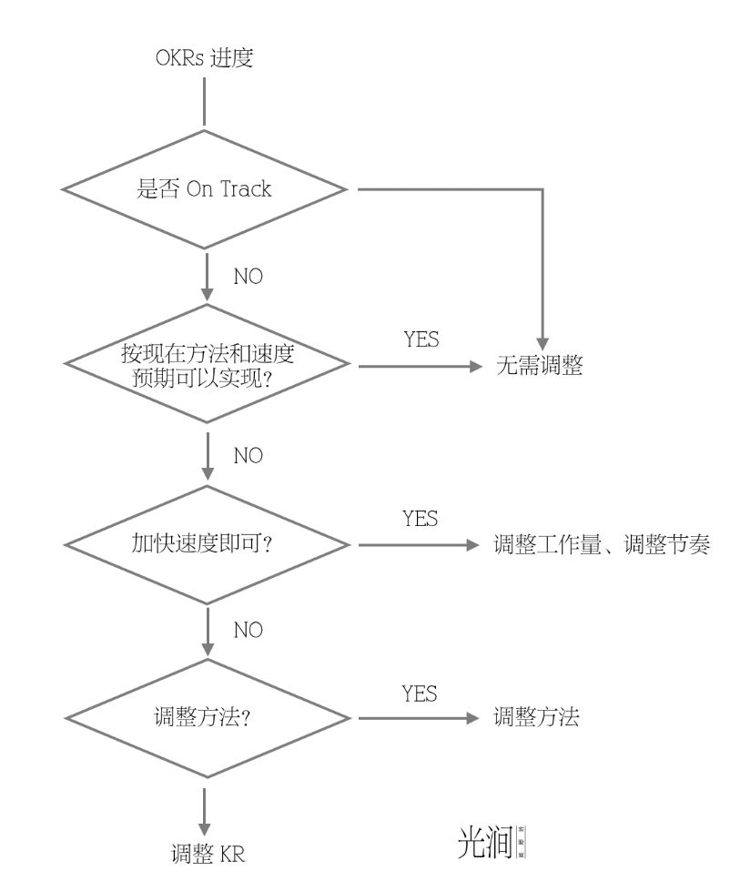 通常情况下,我们会进行如下图的一系列判断,并做出相应的调整。为什么现在不是 on track 的情况下,我们还会做一次「按现在方法和速度预期可以实现 OKRs」呢?因为有时候现在进度虽然不足,但可以从当前的进展预估速度将越来越快。