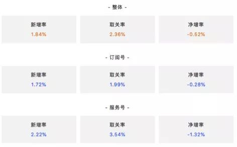 2018年微信订阅号和服务号整体的打开率断崖式下滑,用户增长方面,整体的新增率是1.84%和取关率是2.36%,净增率是负数,也就是说大家都在掉粉。