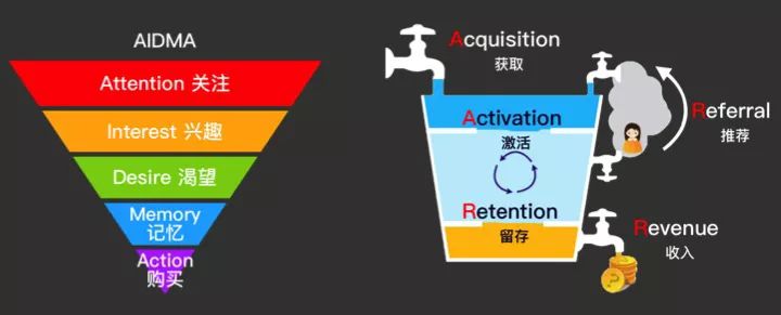 右:AARRR模型对应用户生命周期中的5个重要环节,用来跟踪产品营销和管理,是用户增长的利器。