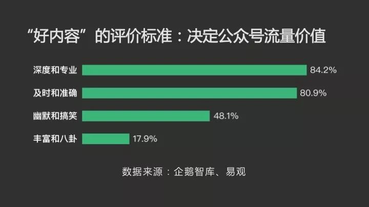 当然形式也是依附于好选题与内容的基础之上,在一组来自企鹅智酷、易观的数据中:84.2%的用户认为深度和专业是好内容的首要条件,其次是内容的及时和准确。