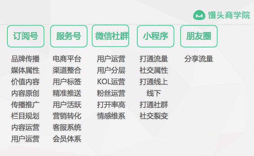 我们的目标变成,订阅号更看重转发率,服务号看重用户触达率,微信社群是社群体系的搭建和用户分层,小程序是打通流量拉动新用户,朋友圈是分享转化率。