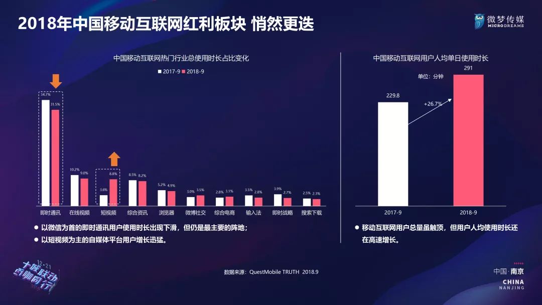 根据微梦传媒数据显示:2018年中国移动互联网热门行业总使用时长占比变化,可以看到以短视频为主的自媒体平台用户增长迅猛。短视频将是新媒体人要去关注的新阵地。