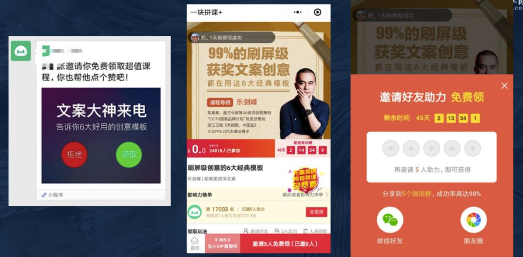 比如,我们用文案课拉新的活动,消息从订阅号发出来,参与活动的二维码是服务号(要能够记录用户参数)的二维码,关注服务号之后弹出一个小程序,通过小程序助力,打通微信社群和朋友圈,我们很快就有几万新增用户。