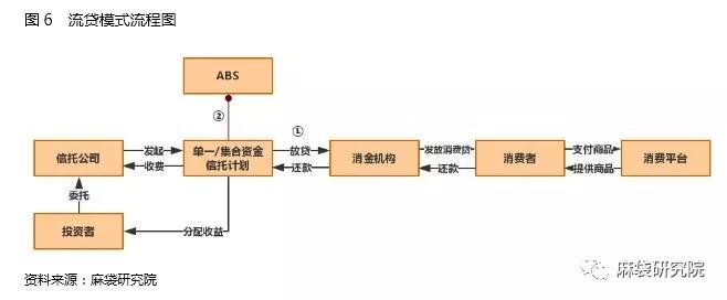该流程中,由信托公司发起单一或集合资金信托计划,再由该计划向消费者发放贷款。消费者使用贷款资金向消费平台支付商品或服务款项。此后,消费平台向消费者提供商品,消费者按期还款,信托公司从成立的信托计划的本金及收益中收取管理费。而投资者层面,则是由投资者向信托公司委托资金,到期后由信托计划向投资者分配收益。